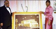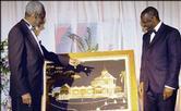 Left: Sir Howard Cooke views a bamboo sketch of King's House, which was presented to him by Gewn Clarke, wife of the bank's head, William 'Bill' Clarke. Right: Prime Minister P.J. Patterson (left) views a bamboo sketch of Vale Royal presented to him by president of Bank of Nova Scotia Jamaica, William Clarke.