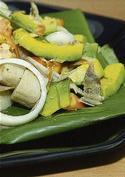 Left: Enhance left-over chicken in a fresh new way by combining it with slices of avocado and almonds. Right: Avocado-banana salad comprising boiled green banana pieces with assorted herbs, the season's fresh ripe avocado and garnished with onion rings. - Ricardo Makyn/Staff Photographer