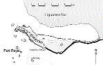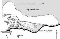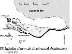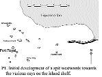 The rest of the story of the development of Palisadoes basically consists of several repetitions of this process of capture of sediment supply through the initiation of spit growth in a new direction, leading to the starvation of the sediment supply and cessation of growth of each former spit in turn (diagrams P4 to P5). The most recent phase in the evolution of Palisadoes appears to have taken place in the last 500 years (P6). When the Spanish first came to Jamaica at the end of the 15th century Port Royal was still an island. Since then it has become more or less firmly joined to the rest of the Palisadoes.