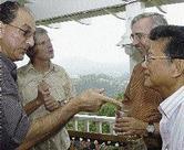 Left: Thalia Lyn (second right) presents a painting to Chinese Ambassador Zhao Zhenyu and wife, Wang Xiaoju, as husband, Michael Lyn, looks on. The Lyns hosted a farewell brunch for the diplomats.(center) The inseparable Marigold and Ossie Harding look picture-perfect at the farewell brunch.( Right l-r) John Issa makes a point to French Ambassador Francis Hurtut, Canadian High Commissioner Denis Kingsley and Lascelles Chin. - photos by Ricardo Makyn/Staff Photographer