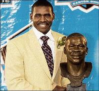Michael Irvin stands with his bust at the Pro Football Hall of Fame, Saturday night in Canton, Ohio. - AP Photo/Phil Long
