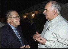 President of the World Federation of Consuls, Arnold Foote (left), chats with Ed Wehrli of the American Embassy.