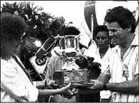 THE WINNING TRAINER: Topline trainer, Phillip Feanny receives his trophy from Linda Gambrill, a director of Desnoes & Geddes Limited, after THE VICEROY's victory in the 1989 Red Stripe Superstakes. - file photos