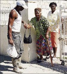 These two persons assist an old lady after she received her Christmas gift of basic food items. - Photos by Dalton Laing