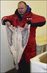Left: NSvein Wara, marketing manager of the Norwegian Seafood Export council, holds a 20-pound cod after it had been cut open and the bone removed. This is the size imported by Brazil. Right: A fisherman displays a freshly caught cod; the head is quite normal. - photos by Barbara Ellington