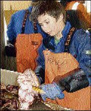 Twelve-year-old Preben removes the tongue from the head of a codfish at Gleaa Factory in Rost, Norway; he makes up to US$9 per kilo after school. They are only limited by availability of heads and boys vie for the jobs.