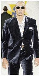 Right: This Carlton Brown navy blue velvet suit with polka-dot scarf and handkerchief , one of Brown's formal suits, was featured in Martha Stewart's magazine.