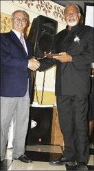 Cecil Cooper (right) accepts his gold plaque, designed by Phillip Supersad, from chairman of the board of directors of the Edna Manley College, Paul Issa, at the college's Long-Service Awards held on Monday, June 30, at the Terra Nova All-Suite Hotel. Cooper was among 61 awardees