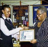 The Gleaner's Latoya Grindley (left) accepts a certificate of appreciation for The Gleaner's support from Joy Crawford.
