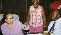 In post-meeting discussion are Judith Douglas (left), Lieutenant Governor Kay Anderson (centre) and lieutenant governor-designate Leighton McKnight. They are at the Kiwanis Club of New Kingston meeting and media appreciation, last Wednesday.