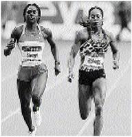 Sanya Richards of the US (right) speeds to win the 200 metres competition against Kerron Stewart from Jamaica during the IAAF World Athletics Final at the Mercedes-Benz Arena in Stuttgart, Germany, yesterday. - AP photos