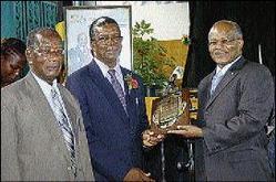 Beryl Rochester (centre) receives the Governor General's Achievement Award from Governor General Sir Kenneth Hall. Looking on at left is Custos of St Elizabeth, Alfred Farquharson.