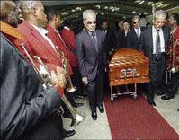 At first, there were no visible signs of grief - no tears - instead, a carnival-like atmosphere filled the auditorium. When the Dragonaires kicked off the service with an instrumental of Dumplings and rolled back the hands of time with an assortment of hits, it seemed as though there would be little mourning.