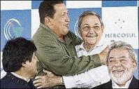 Venezuela's president, Hugo Chavez (top left), talks to Cuba's president, Raul Castro (top right), as Bolivia's president, Evo Morales (left) and Brazil's president, Luiz Inacio Lula da Silva, look on before the official photo of the summit of Latin American and Caribbean leaders in Costa do Sauipe, Brazil on Tuesday.