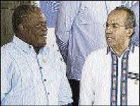 Mexico's President Felipe Calderon (right) talks to Bahamas' prime minister, Sir Hubert Alexander Ingraham, during a summit of Latin American and Caribbean leaders in Costa do Sauipe, Brazil on Wednesday.