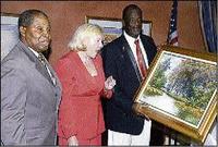 Ambassador Brenda LaGrange Johnson (centre) was in awe at the beauty of this painting by local artist Paul Blackwood. The gift was from members of the Jamaica America Friendship Association. From left are the association's president, Morin Seymour, and vice-president, Errol Brennan.