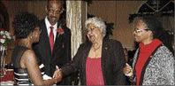 Lorna Golding (left) patron of 'A Touch of Red', the World AIDS Day fund-raising dinner, greets Mary Sorum (second right), while Howard Hamilton QC and Patricia Donald share the moment.The dinner was hosted by the Jamaica Business Council on HIV and AIDS and the National AIDS Council.