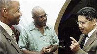 Winston Fletcher (centre), president of the St Catherine Credit Union, in discussion with Sam Green (left) and David Wan, chairman of Cuna Mutual Insurance Society, at the St Catherine Co-operative Credit Union awards dinner and party at the Waterfalls in St Andrew last Friday.