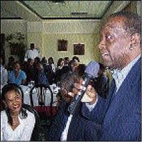 Left: Minister of Mining and Telecommunications, Derrick Smith (right), has the audience in stitches at the ministry's Christmas luncheon last Thursday at Jade Garden Restaurant, Sovereign Centre, St Andrew. - Contributed