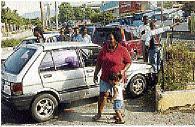 The driver of this Nissan Caravan van removes a damaged head lamp from his vehicle after a three-vehicle accident at the intersection of Lyndhurst Road and Beechwood Avenue in St Andrew yesterday.