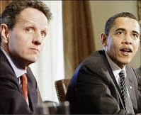 United States Treasury Secretary Timothy Geithner (left) and President Barack Obama in the Cabinet Room of the White House in Washington on Monday, March 23. - AP