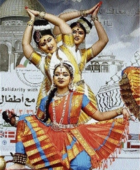 Dancers perform a traditional dance during a day of solidarity with the children of Gaza at the Palestinian embassy in Riyadh, Saudi Arabia, yesterday.
