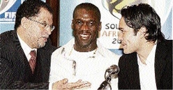 President of the 2010 World Cup organising committee, Dr Danny Jordaan, left, AC Milan Dutch midfielder Clarence Seedorf (centre), and Inter Milan Chilean midfielder Luis Jimenez at yesterday's news conference in Milan, Italy. Jordaan said he expects the construction of all stadia to be completed by October 2009.