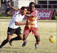 Fabian Gordon (left) of Rivoli United and Troy Smith of Village United in a keen tussle in their Digicel Premier League game at the Elliston-Wakeland Centre in Falmouth on Wednesday. Rivoli won 3-1. - Photo by Richard Morais